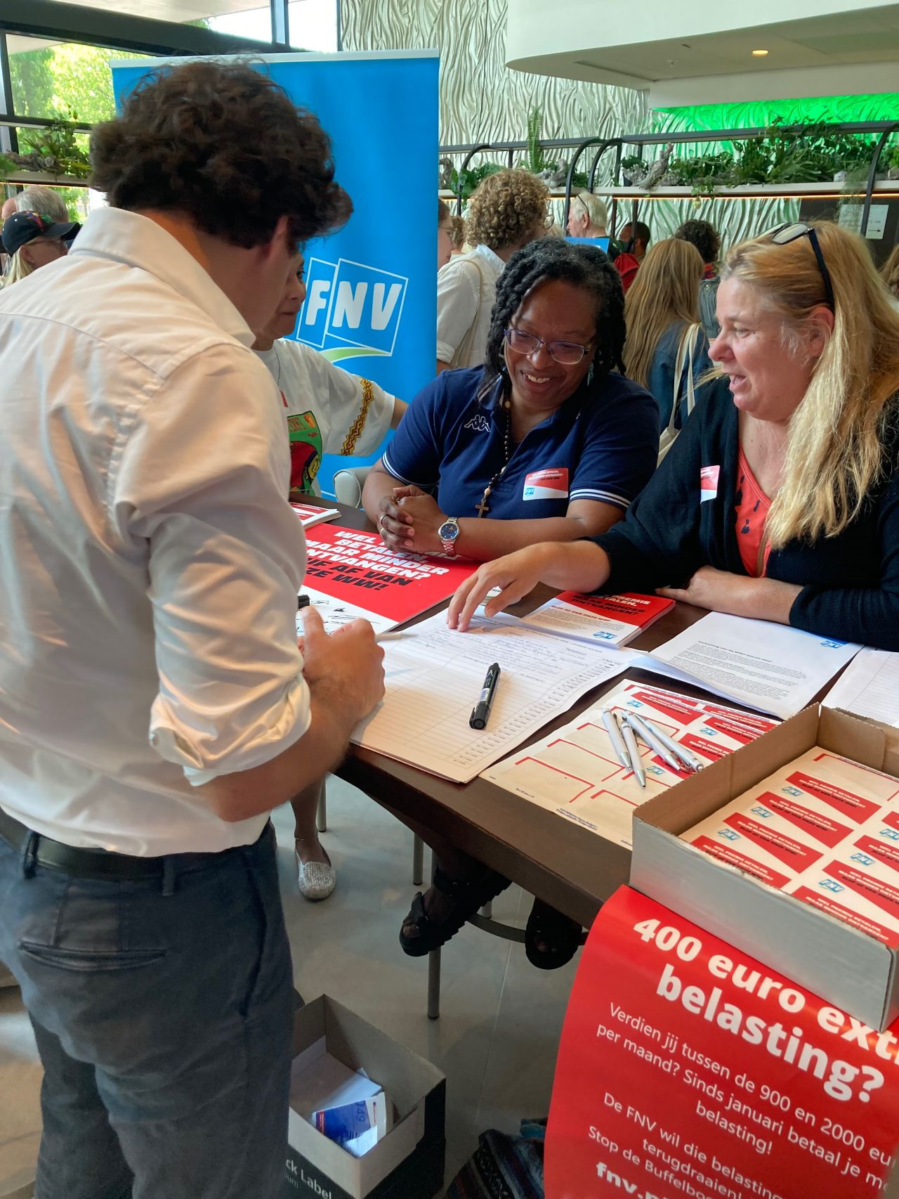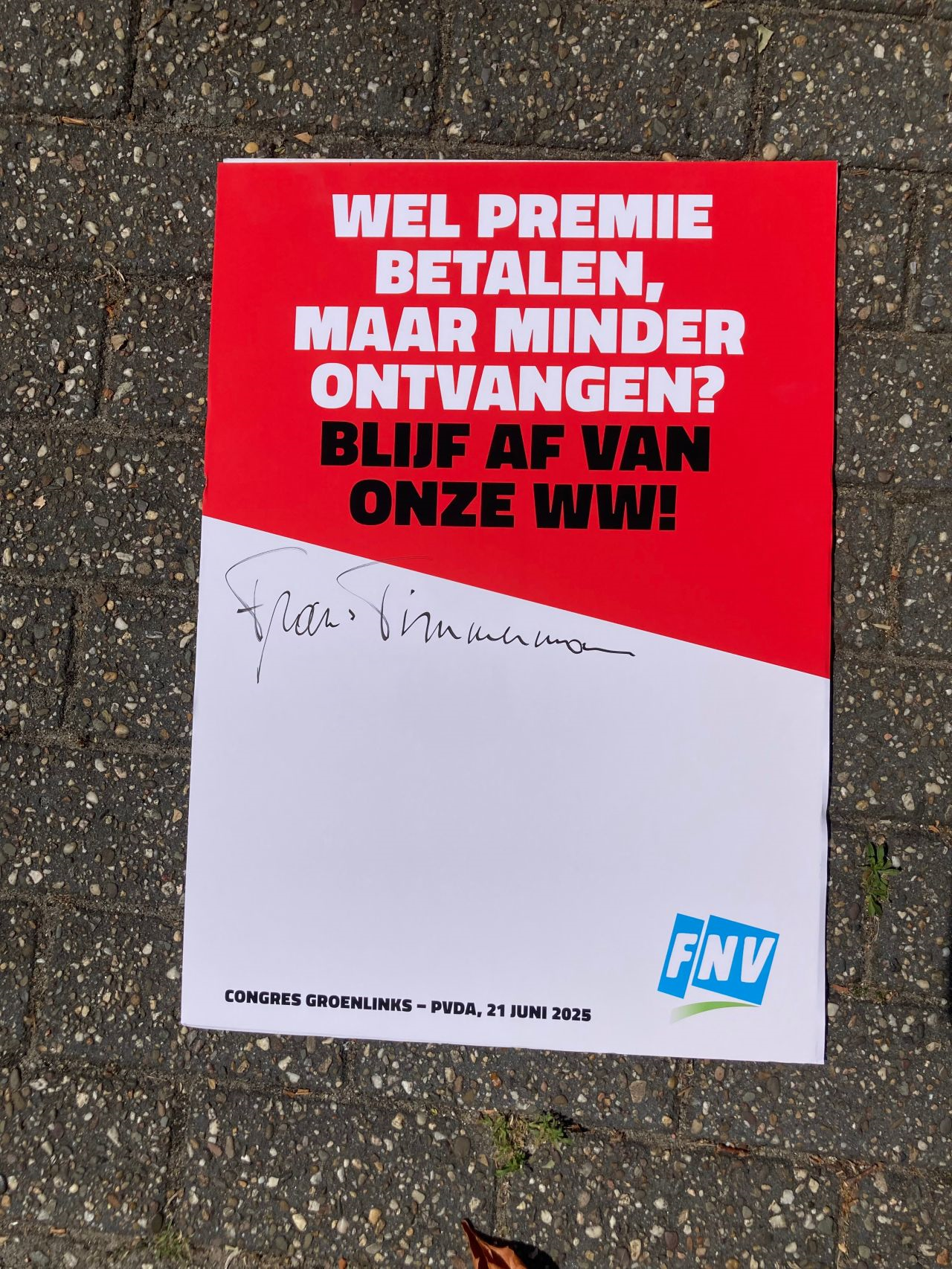 We spraken honderden bezoekers, haalden handtekeningen op en deelden opvallende stickers uit om onze boodschap zichtbaar te maken: blijf af van de WW en WIA – het zijn ónze verzekeringen. En dat werkte. De actie trok volop aandacht: van leden en kopstukken. Tweede Kamerleden zoals Mariët Patijn, Esmah Lahlah, Jesse Klaver en lijsttrekker Frans Timmermans toonden zich solidair.