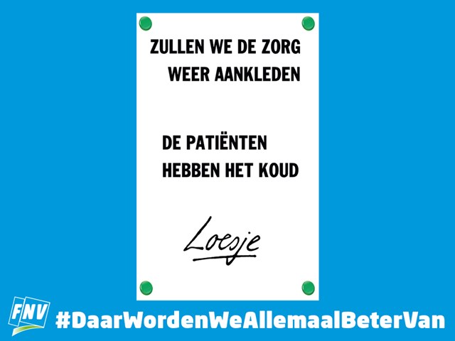 We hebben samen met Loesje teksten ontwikkeld voor elke branche. Download de posters, print ze uit, hang ze op, deel het op social media met de hashtag #DaarWordenWeAllemaalBeterVan en tag degenen die zich met hart en ziel inzetten voor goede zorg.