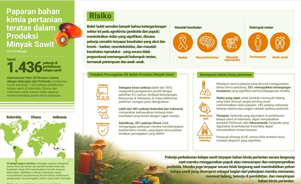 Penelitian ini, yang ditugaskan oleh International Palm Oil Workers United (IPOWU) dan didanai oleh Mondiaal FNV, mengungkap risiko kesehatan signifikan yang dihadapi pekerja perkebunan kelapa sawit di Kolombia, Ghana, dan Indonesia akibat paparan bahan kimia berbahaya. Meskipun minyak kelapa sawit memiliki nilai ekonomi yang tinggi, produksinya sering kali melibatkan penggunaan pestisida dan pupuk berbahaya, yang membahayakan kesehatan pekerja dengan risiko penyakit serius seperti kanker, gangguan pernapasan, dan masalah kulit, terutama bagi kelompok rentan.