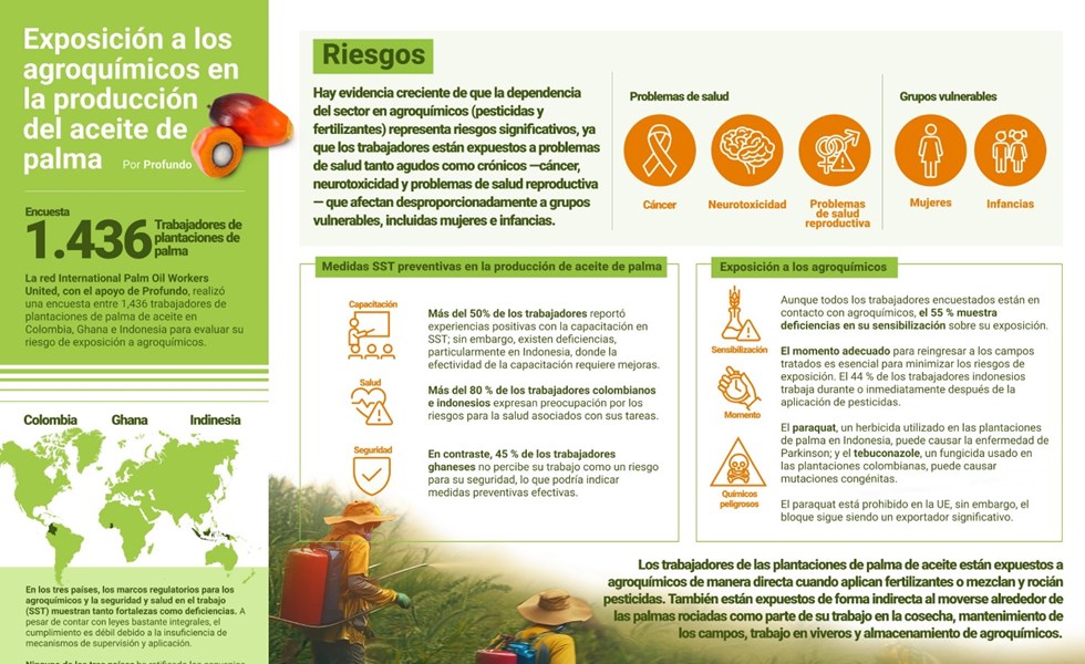 Esta investigación, encargada por la International Palm Oil Workers United (IPOWU) y financiada por Mondiaal FNV, revela los significativos riesgos de salud que enfrentan los trabajadores de las plantaciones de palma de aceite en Colombia, Ghana y Indonesia debido a la exposición a agroquímicos peligrosos. A pesar del valor económico del aceite de palma, su producción frecuentemente implica el uso de pesticidas y fertilizantes peligrosos que exponen a los trabajadores a graves problemas de salud, como cáncer, problemas respiratorios y afecciones cutáneas, afectando especialmente a los grupos vulnerables.