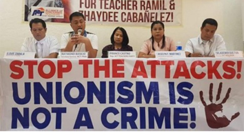 Het antivakbondsklimaat onder het Duterte-regime zorgt voor angst onder vakbondsleden, onderwijzers en academici voor hun rechten en veiligheid. Raymond Basilio, ACT algemeen secretaris, heeft sinds januari 2019 meerdere doodsbedreigingen ontvangen. De onderwijzersvakbond wordt door de regering ‘red-tagged’. Daardoor worden vakbondsactivisten door de Filipijnse politie op een lijst met ‘terroristen’ gezet. Twee ACT-leden zijn recent in hun klaslokaal beschoten door gemaskerde mannen, in de aanwezigheid van leerlingen.