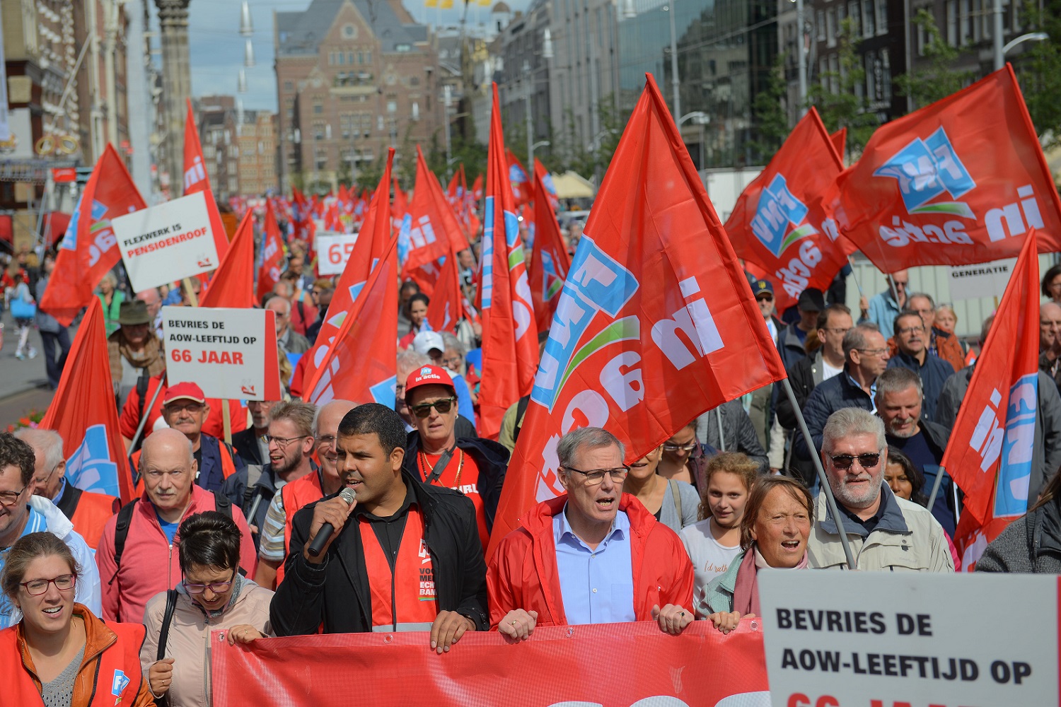Tuur Elzinga, vicevoorzitter FNV: ‘Ook nu het economisch goed gaat, wil dit kabinet nog steeds geen geld uittrekken voor de grote pensioenproblemen. Sterker nog, het bezuinigt sinds de afgelopen crisis elk jaar meer op de AOW. Intussen is dat al 3 miljard op jaarbasis. Wij zeggen: bevries de AOW-leeftijd en schrap de boete op eerder stoppen. Zodat mensen met zwaar werk en ploegendiensten ook weer gezond hun pensioen kunnen halen.’