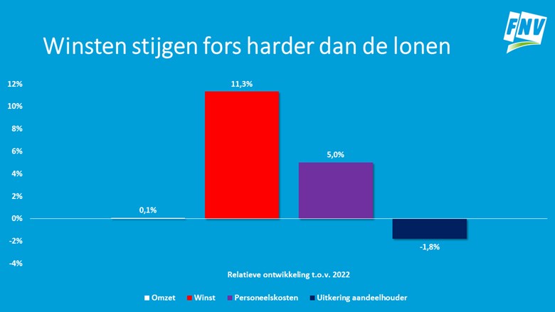 Een tweede belangrijk resultaat uit dit rapport is dat de winsten (voor belasting) twee keer zo hard stegen als de personeelskosten; deze groeiden slechts met 5%. ‘De kloof tussen de salarissen van werknemers en de winsten van bedrijven wordt hiermee nóg groter. Dus terwijl gezinnen zich dagelijks zorgen maken over hun rekeningen en bestaanszekerheid, zijn bedrijven steeds grotere winsten aan het binnenharken’, zegt Petra Bolster, lid Dagelijks Bestuur bij de FNV.