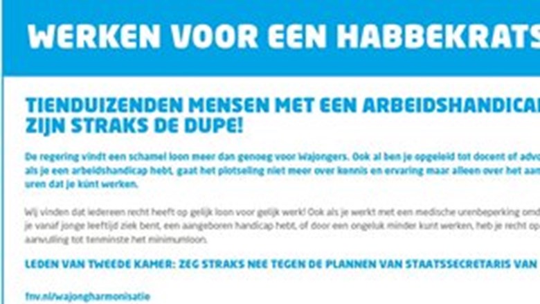 FNV heeft samen met 11 andere organisaties een brandbrief gestuurd aan de Tweede Kamer, die vandaag van plan is te gaan stemmen over de Wajongmaatregelen. Tienduizenden mensen met een arbeidshandicap zijn straks de dupe en kunnen nooit méér dan het minimumloon verdienen. In een advertentie in dagblad Trouw roepen de 11 organisaties de Tweede Kamer op om tegen het voorstel van staatssecretaris Van Ark te stemmen.