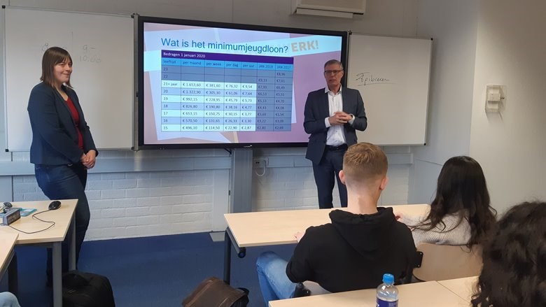 ‘Wie kan mij vertellen wat een vakbond is?’, Dat is de vraag waar de nieuwe lesmodule Sterk aan het werk! mee begint, en de vraag die alle studenten aan het einde van de les kunnen beantwoorden. Toch kan niemand deze vraag beter beantwoorden dan FNV voorzitter Han Busker, en dat heeft hij afgelopen donderdag dan ook gedaan. Samen met oud-gastlesdocente (nu coördinator) Roséanne Timmer-Aukes stond Han voor de klas om zelf de les Sterk aan het werk! te geven. De Studenten hebben veel geleerd. Ze weten nu wat een CAO is, hoe het precies zit met vakantiegeld én dat ze ook met een 0-urencontract recht hebben op betaalde ziektedagen. De studenten van Curio Roosendaal weten nu waar ze recht op hebben en hoe de vakbond ervoor gezorgd heeft dat deze rechten er zijn. Met Han voor de klas hebben de leerlingen direct van de bron gehoord hoe de vakbond strijdt voor een zo goed mogelijk werkend leven.