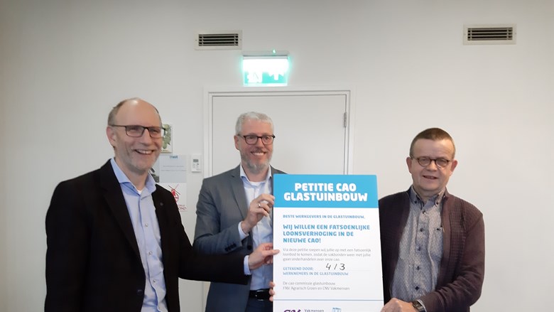 Donderdag 5 december overhandigt een delegatie vakbondsleden namens hun collega’s uit de glastuinbouw een petitie aan de werkgevers. Dat doen ze vooraf aan de onderhandelingen over de nieuwe cao Glastuinbouw. Sander Martins, bestuurder FNV Agrarisch Groen: ‘De petitie is door een grote groep leden ondertekend. Daarmee laten ze zien dat ze een fatsoenlijke cao willen, zonder verslechteringen en met een goede loonontwikkeling.’
