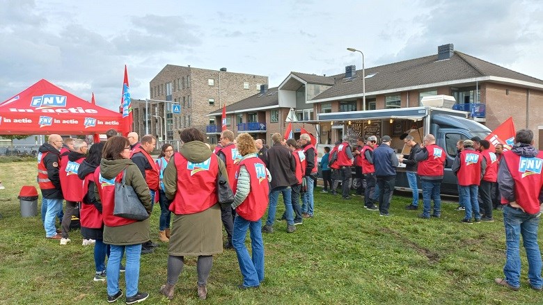 ‘Onze eis van 10 % structurele loonsverhoging voor alle werknemers, dus ook voor de groep ‘boven cao’ers’, blijft keihard staan. Meer stakingen, ook van langere duur, zijn aanstaande. Tenzij de werkgevers eerder door de bocht gaan…en aan onze cao-eisen wordt voldaan!’