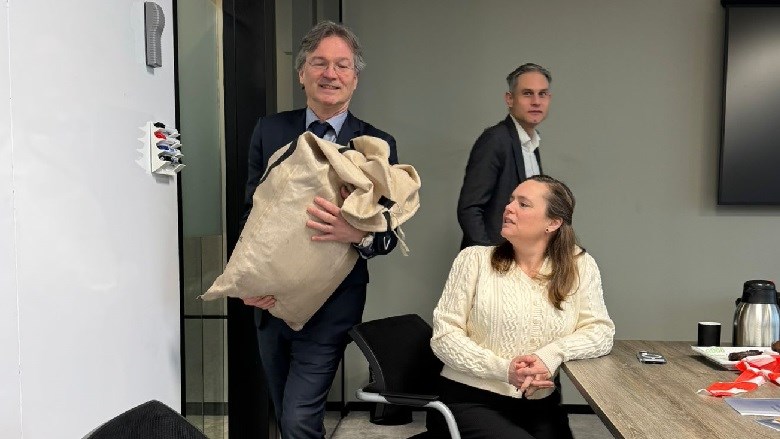 Foto: Arno Visser met een postzak vol kaarten met berichten aan de bouw-werkgevers