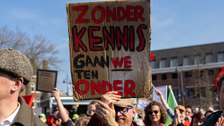 ‘We zien nu al dat de plannen van het kabinet funest uitpakken voor het Nederlandse onderwijs’, zegt Sam Verduijn, bestuurder van FNV Onderwijs en Onderzoek. ‘In de allereerste bezuinigingsrondes van universiteiten en hogescholen verdwijnen meteen tientallen banen. Opleidingen en soms hele vakgroepen dreigen te verdwijnen. De onzekerheid onder de medewerkers is torenhoog. En de werkdruk is nog hoger.’