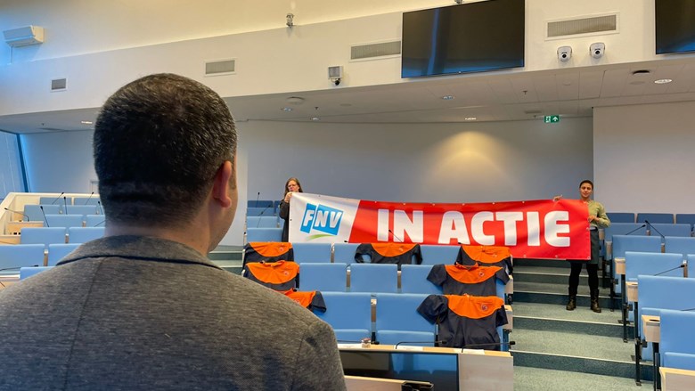 Zakaria Boufangacha, vicevoorzitter van de FNV, heeft een lege zaal toegesproken waar eigenlijk stakende PostNL-medewerkers gezeten zouden hebben. De staking kon echter niet doorgaan, omdat PostNL, met hulp van de rechtbank, de stakers te hoge voorwaarden oplegde.