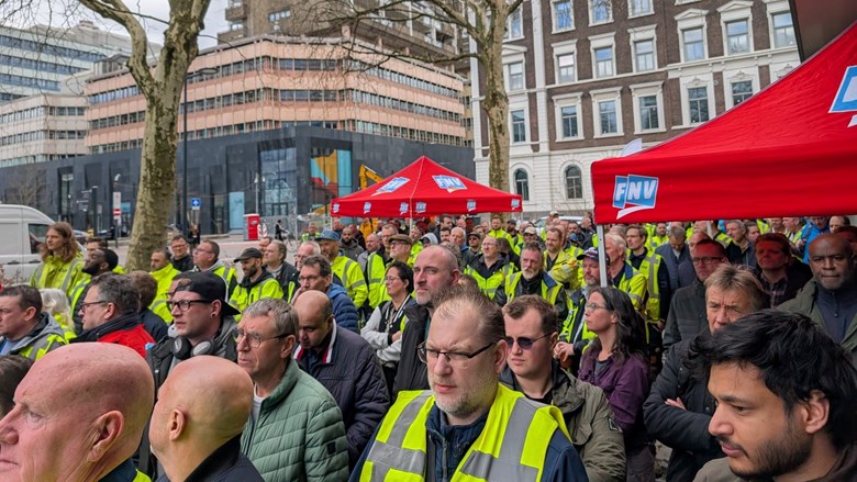 Beeld: Op woensdag 26 maart heeft een groep van 350 werknemers spontaan bij het hoofdkantoor van NS actiegevoerd. De actie van monteurs en werknemers Besturing Operatie heeft geholpen.