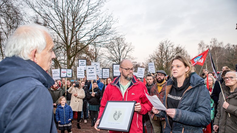De zorg voor 2400 cliënten bij Amerpoort staat al jaren onder druk. En nu wil de directie de diensturen van haar personeel nóg verder inkorten. Dat vinden wij onacceptabel. Daarom voerden meer dan 100 medewerkers op 3 december actie. Zij overhandigden bestuurder Paul Willems hun gebroken zorg-hart.