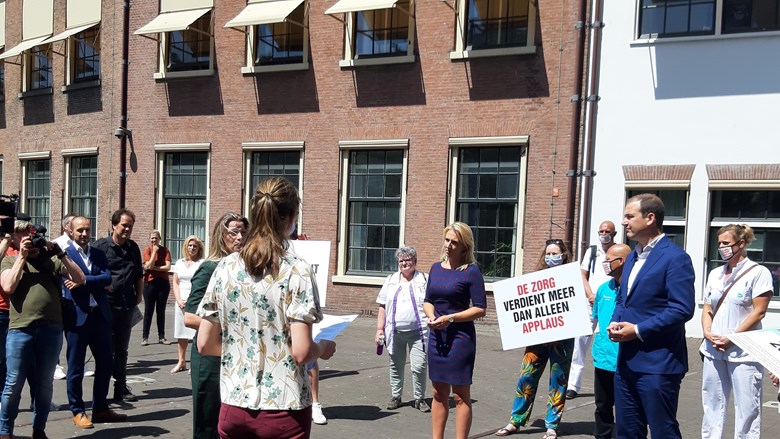 De motie van Asscher en Marijnissen: betere structurele arbeidsvoorwaarden voor het zorgpersoneel. Vandaag werd erover gestemd in de Tweede Kamer en FNV-leden uit diverse Haagse ziekenhuizen kwamen om Kamerleden te overtuigen vóór te stemmen. Want een eenmalig applaus is leuk, maar een blijvende beloning beter.