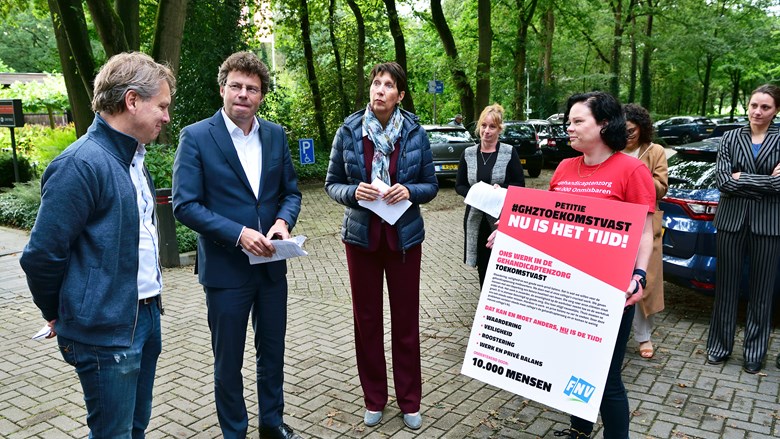 De onderhandelingen voor een nieuwe cao in de gehandicaptenzorg zijn vandaag van start gegaan. In aanloop naar het eerste gesprek boden FNV-leden de voorzitter van de werkgeversdelegatie een bord aan met 10.000 handtekeningen van bezorgde GHZ-medewerkers. Hier waren ook ouders van cliënten bij aanwezig.