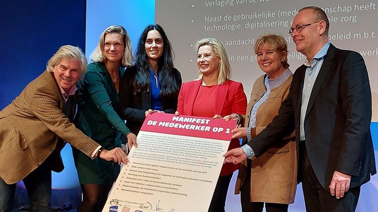 Naast FNV Zorg & Welzijn ondertekenden Actiz, Zorgthuisnl, CNV Zorg & Welzijn, FBZ en NU’91 op 30 november het manifest. De partijen vinden dat de medewerker weer op 1 moet staan in de VVT. Hun doel is duidelijk. Bert de Haas, vakbondsbestuurder FNV: ‘Het is 5 over twaalf. We hebben al een zorginfarct. Als de overheid nu geen maatregelen neemt, dan is het tij niet meer keren.’