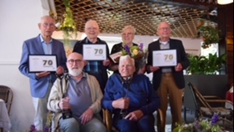 Tijdens een etentje zijn de jubilarissen die al 70 en 75 jaar lid zijn, gehuldigd en in het zonnetje gezet.